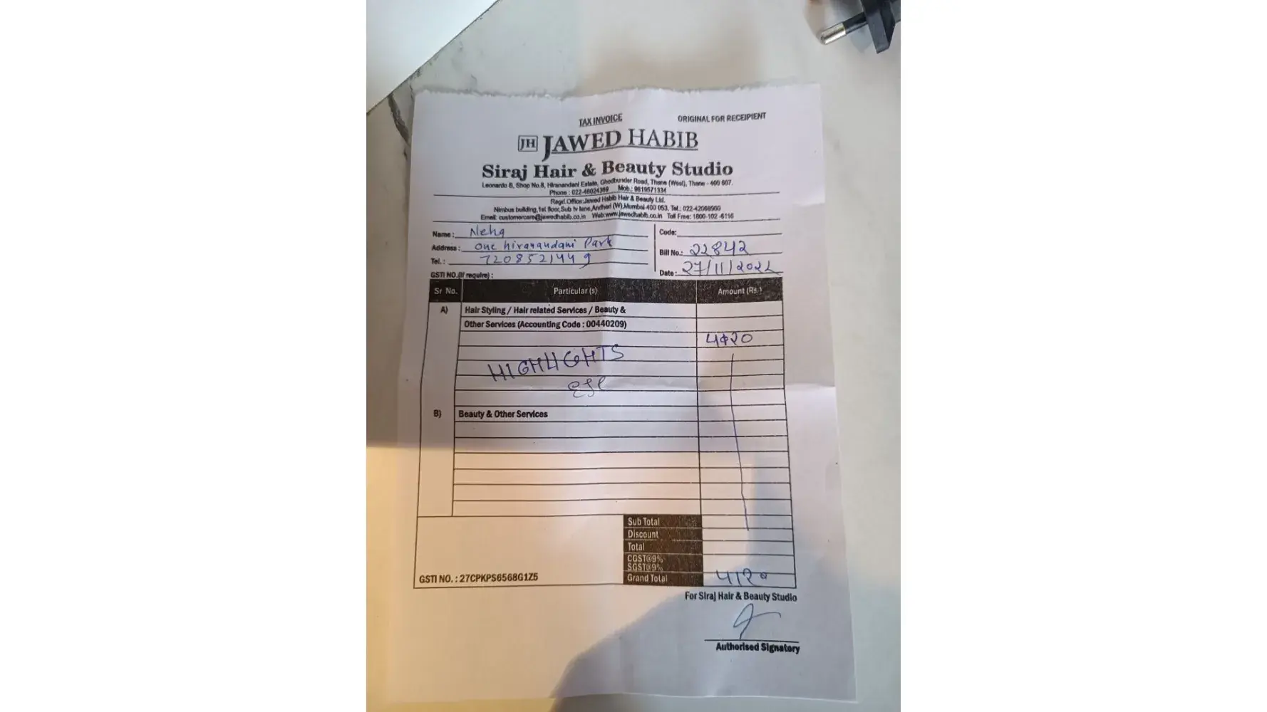 This time I immediately raised my concern to the staff but they said I need to visit the salon so I went there and then they said I will directly get the call From jawed Habib varthur salon owner for the solution.