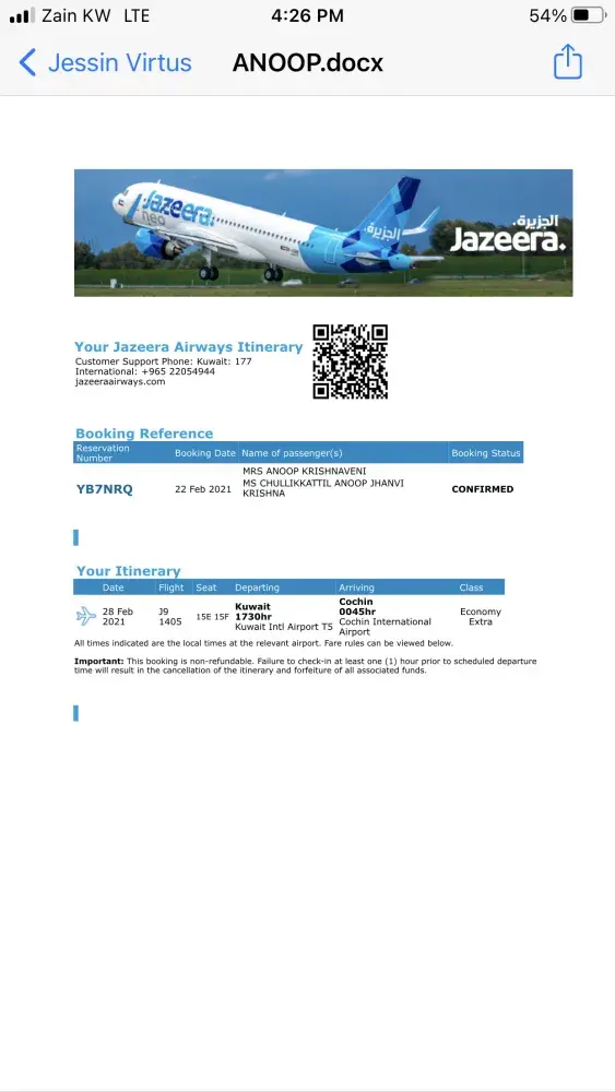 With reference to above subject, kindly be informed that I have booked 2 tickets to Cochin on 28 feb 2021 for Mrs Krishnaveni Anoop and Jhanvi Krishna (2 year old) and I have contacted jazeera customer care on 25 feb 2021 at 6:31 pm and 26 feb feb 2021 at 12:30 pm and got informed that below 5 year old child no need to do PCR . Hence I have done PCR for Mrs. Krishnaveni only.