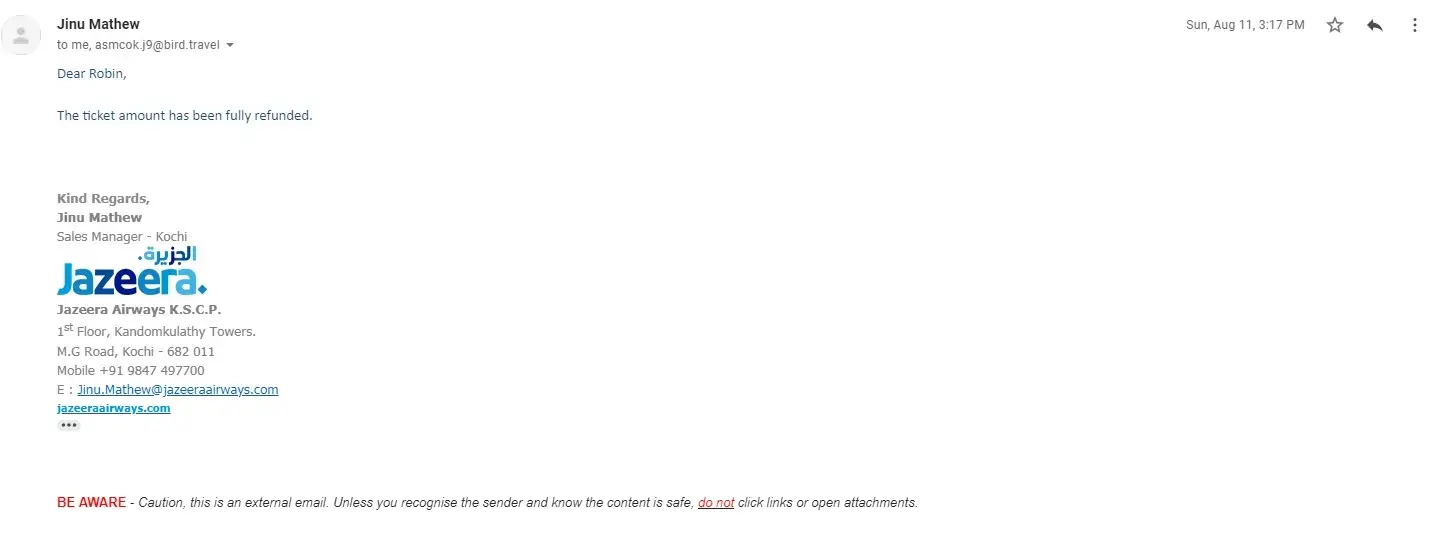 Please be informed that I had a reservation in Jazeera Airways for travelling from Cochin to Kuwait on Aug. 10, 2019. It was rescheduled for Aug. 12, 2019. Due to flood and bad weather conditions, I don't think I can reach to Nedumbasseri from Kollam, Kerala for the fly and I decided take an early flight from Trivandrum, Kerala. Since my visa is going to expire I don't want to take risks by choosing again Nedumabasseri for my travel. So booked another flight from Trivandum, Kerala. Attached my ticket copy for your reference. My ticket was booked through a travel agent (Unimoni Financial Services Ltd.). I send email to Jazeera to explain the situation and they told me my ticket will cancel, they are gonna process refund. After few weeks I got a confirmation that the refund has been done from Jazeera's side and get in touch with Travel Agent ((Unimoni Financial Services Ltd.). Until now (03/09/2019), after successful completion of 24 days I haven't received a single penny either from Travel Agent or from the airline.