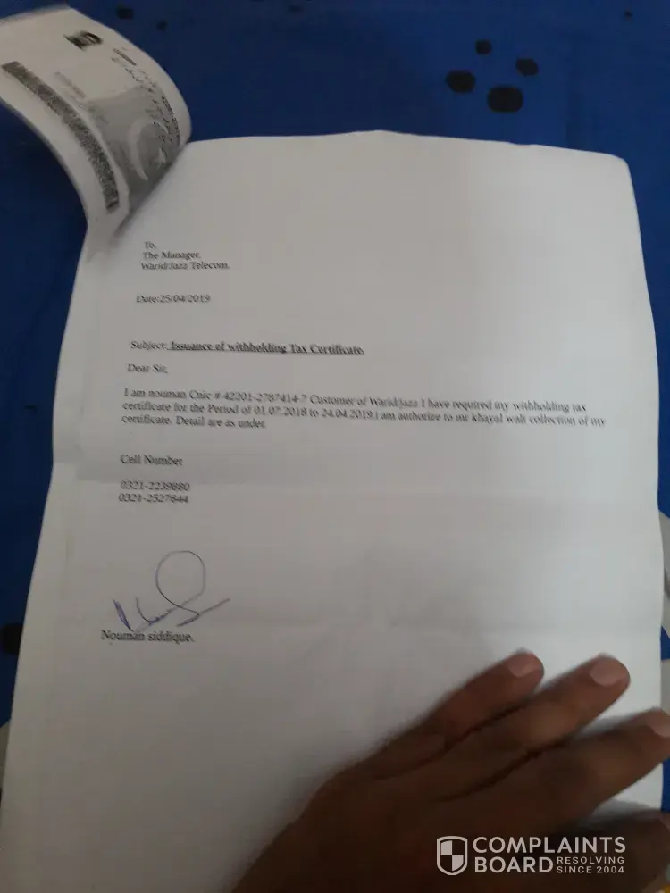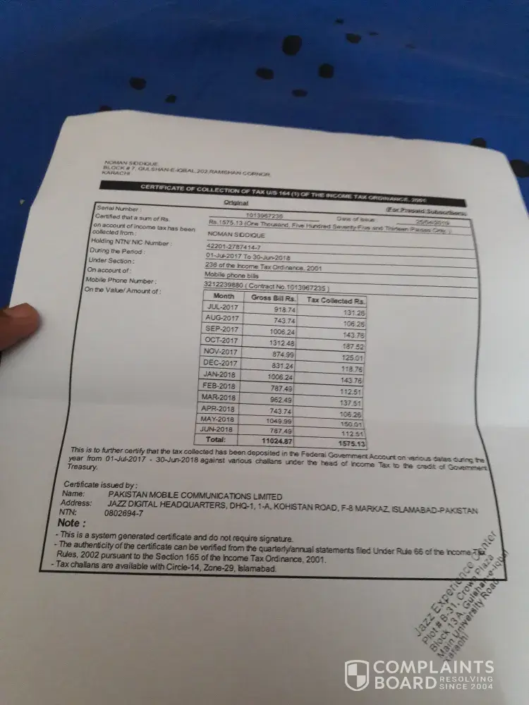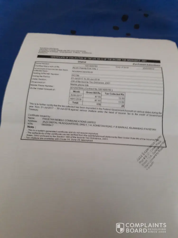 Jazz (formerly Warid Telecom) Tax certificate