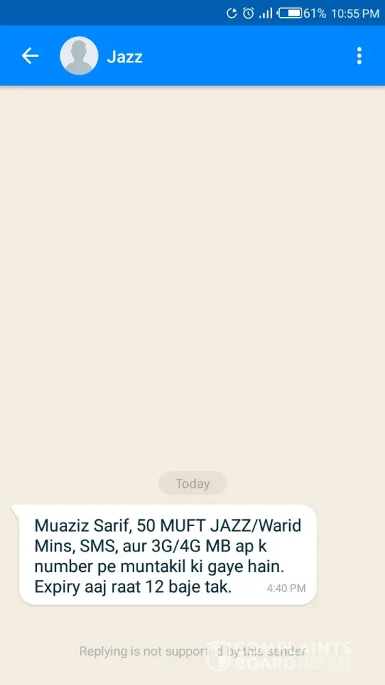 Muaziz Sarif, 50 MUFT JAZZ/Warid Mins, SMS, aur 3G/4G MB ap k number pe muntakil ki gaye hain. Expiry aaj raat 12 baje tak.(at 4:40pm).