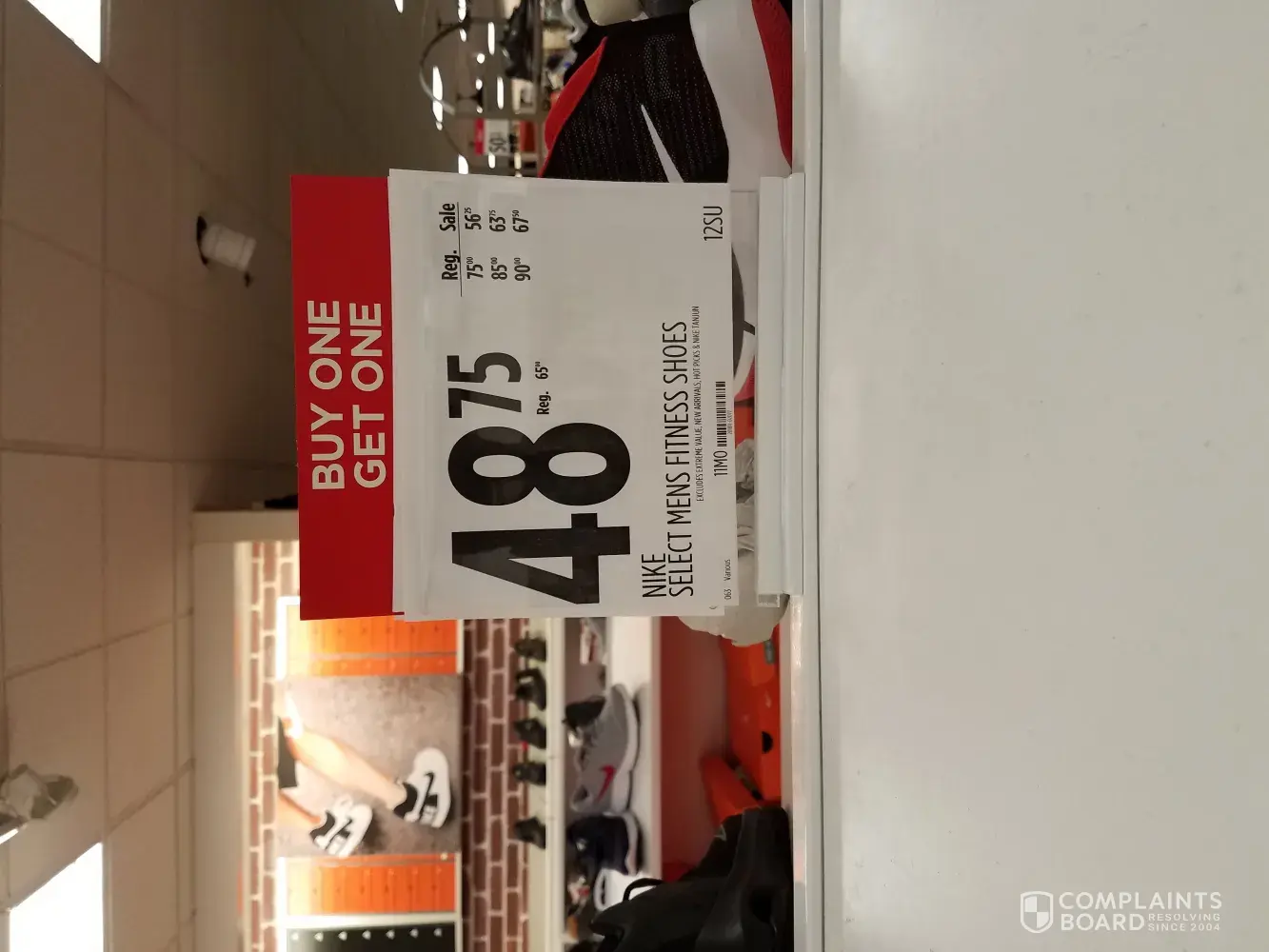 I visit the JCPenney store in Florence South Carolina on Saturday April 28th 2017 around 8 p.m. I saw some Nike select men's shoes. There was a sign on it that said buy one get one . so I inquired to a customer service to a cashier by the name of Morgan she interned came back and look at it and she said she didn't know whether it was buy one get one free or buy one get half off so she went back and checked on that, she came back and she told me that it was buy one but she don't see in the computer. It only scan 48.75 . I asked her since its posted buy one get one and they don't understand the details to explain to me. Can JC Penney honor buy one get one she said that they would go ahead and honor the buy one for 48.75 and get the other pair free. I took the two pairs to Morgan at the cash register. Morgan asked another cashier to show her how to put it in the computer, then there was a dispute about I had to pay regular price 65.00 for one and get the second pair for 48.75. I stated that that's not what it said it said 48.75 buy one get one so then shirley came and she said that it's not Morgan department she wouldn't know. Shirley said I have to pay regular price and then you get the other one for half price. Then Macy was call and said the same as Shirley buy one at regular price get the second pair half price. My complaint is that it's posted 48.75 buy one get one.