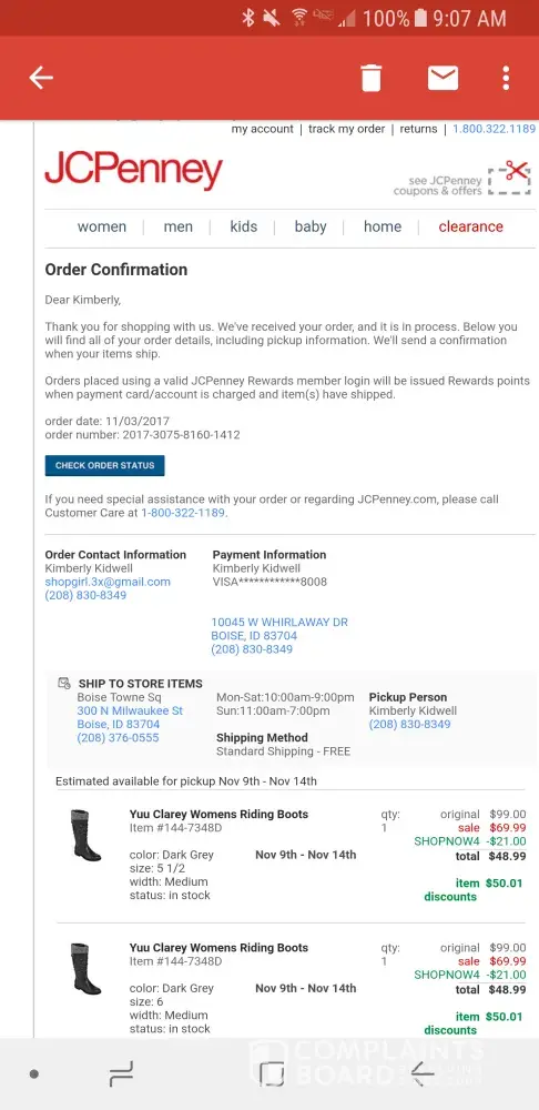 Do not order any items sold through sports fan shop. JCP will charge you for the item which never arrives. In store pick will not cancel the order even though it hasn't arrived, your told to call the 800 number and they tell you a representative will call you back in 48 hrs. 48 hrs later no call back. You have to call them, be placed on ignore for 16 minutes, when connected they tell you only the original store pick up location can cancel the order. REALLY! Such a complete run-a-round. Once you finally get through to someone and get the item cancelled it takes an additional 5 days for the credit to show up. In summary, 30 days wasted, no Ohio State t-shirt and still waiting for the credit.