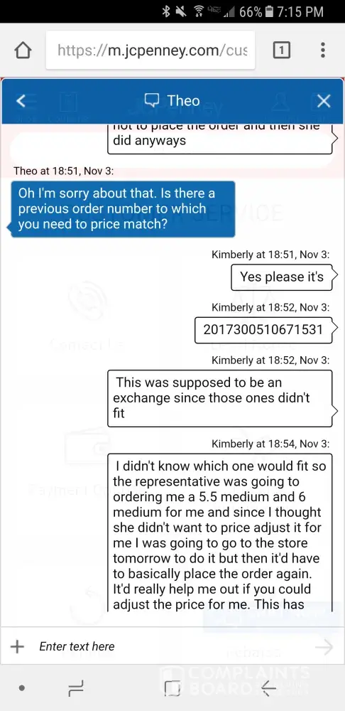 I talked to a gal last night and was re ordering a pair or boots I ordered that didn't fit. After asking for the last 4 of my card on the back, she then told me she could not adjust the price for the boots I originally paid even though it was a reorder. I told her not to place the order and received an email stating she placed it. My account was withdrawn $100 from it when I originally paid less than $10 for the boots. I called customer service 10 min after and they said they couldn't cancel the order. I then spoke to Theo on JC Penny chat and he said he could adjust the price last night. I called customer service this morning and they said he hadn't adjusted it nor could they. I'm pretty upset with customer service over the phone and how I've been treated. My local store is always very nice and helpful but not customer service when I call in. I will not be recommending JC Penny or shopping anymore there.
