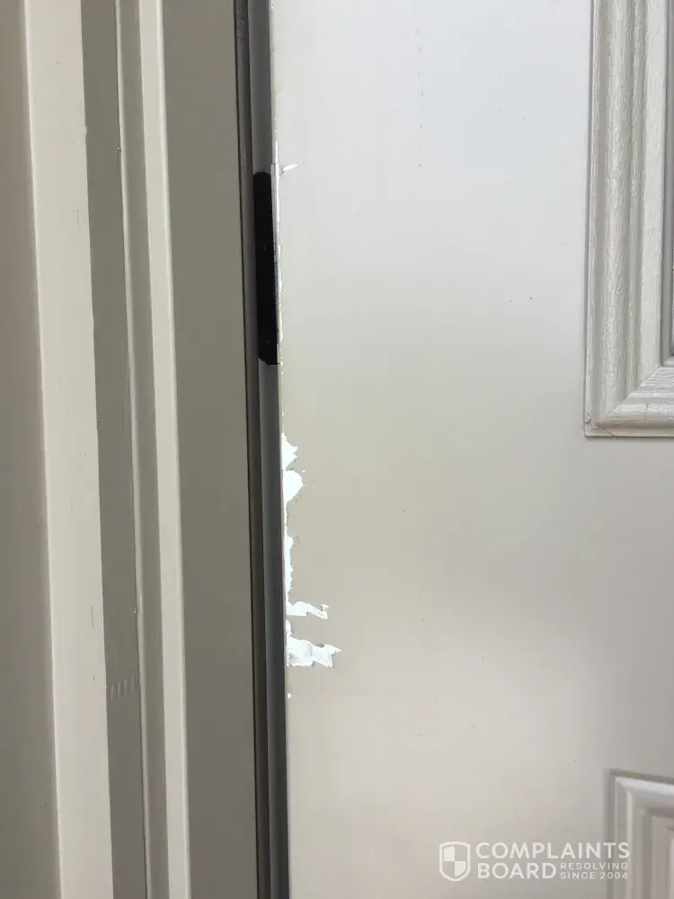 I ordered a Samsung refrigerator from JCPenny.com on June, 18, 2017. On June 23 at 9: 30 am, the delivery crew called me and indicated that they are ready to deliver the Samsung refrigerator into my house. Around 10 am, the crew arrived and first showed me the two dents on the left side of the refrigerator. One of the men offered me $150 allowance for the dents if I decided to keep the refrigerator, which I eventually accepted. When the crew moved the refrigerator through the front entry door, they did not take down the door initially (i.e., take the door off of the door frame). Instead, they tried to force the refrigerator into the house with the door hung on the door frame. This caused visible damages and dents on the brand new front entry door as well as the door frame. Once they realized that they were unable to move the refrigerator into the house, they decided to take down the door. However, the damages had already been caused.