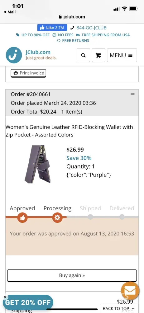 11/23/20: On Sept. 8, 2020 (small order-4 items) and again on Sept. 30, 2020 (lg. order-20 items) I ordered & paid $534.98 for a total of 24 items from ''jclub.com' Company. Order #'s are: 2243839, 2254679, 2243853, 2254738, & 2254704. It is now Nov. 23rd, & only 3 items ($84.99) of the original 24 have been delivered to me as of this date. Since mid-Oct. to today, I have sent 3 separate E-mails with no response, & called their Customer Service # 4 times (including today). Each time, I was put on 'hold' for 35-45 mins. then got 'disconnected'. I tried their 'contact us' email, no response, then phone #, & an 'auto message' transferred me to C/S, put on 'hold' then 'disconnected' again. The package that 'did' come had no return address or company info. at all. To date, I do NOT have $479.00 of merchandise I have already paid for! I believe I have been Scamed by this website. I attached copies of my 'documentation' to this message.