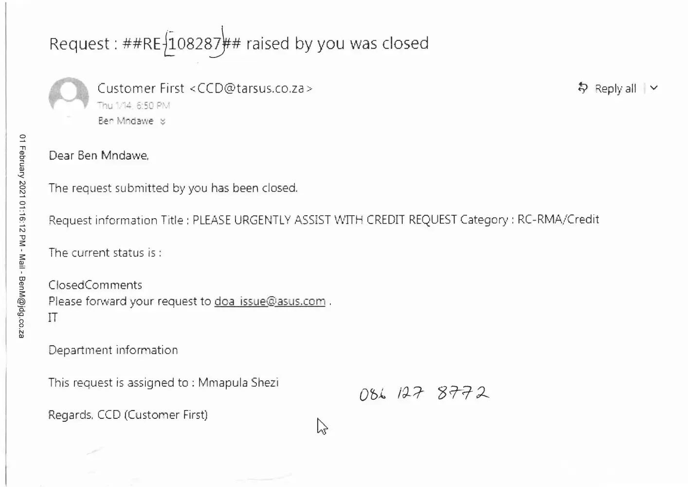 I also called the Call Centre on the day, 29 Jan 2021 @ 10:02, to log a complaint, ref# [protected].I called them again on the 4th Feb 2021 as I had not heard back from them, only to find out that the issue has been marked as resolved 😡