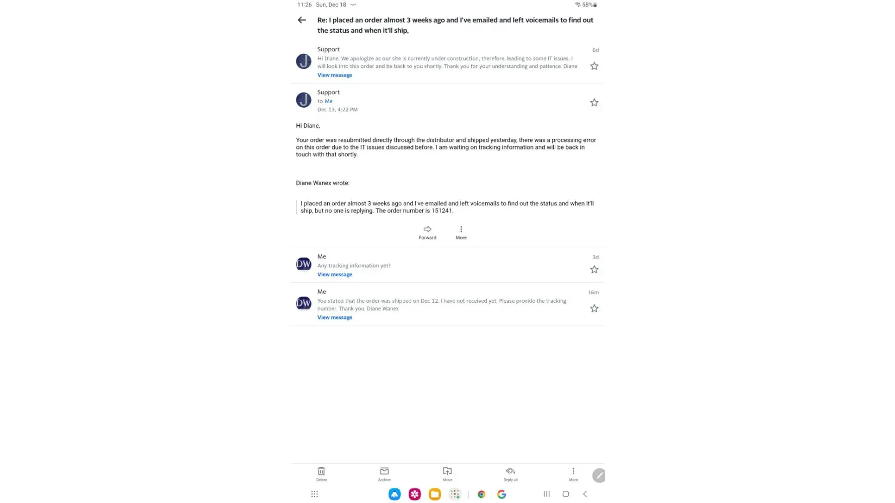 Placed order #151241 on nov 25 but never received it. I left multiple voicemails, emails & website chats concerning this. Finally received a response to a chat that order was reentered and supposedly shipped on Dec 12. I've asked multiple times for the tracking info with no response. Your customer service is the worst I've ever experienced.