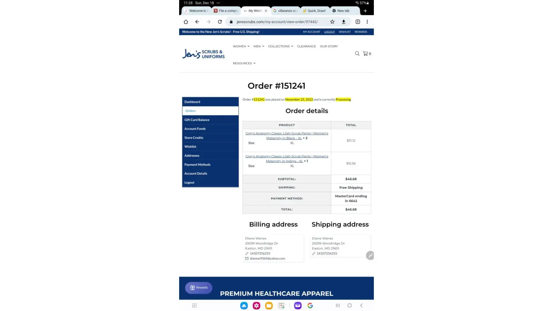I ordered Scrubs from Jen's Scrubs on February 14th 2016, I am still waiting for part of the order. They shipped some things separate because some of them were on "back order". I spoke with one Representative that sent me a free pair of pants and told me that my Jacket was "on the way" I have yet to see the jacket weeks later. I also made another order (big mistake) because there was a sale and the price was very low. It was literally too good to be true. That order was made on March 26, 2016 and the status is shipped but there is not a tracking number or any other proof that it was actually shipped. I will NEVER order from this business again.