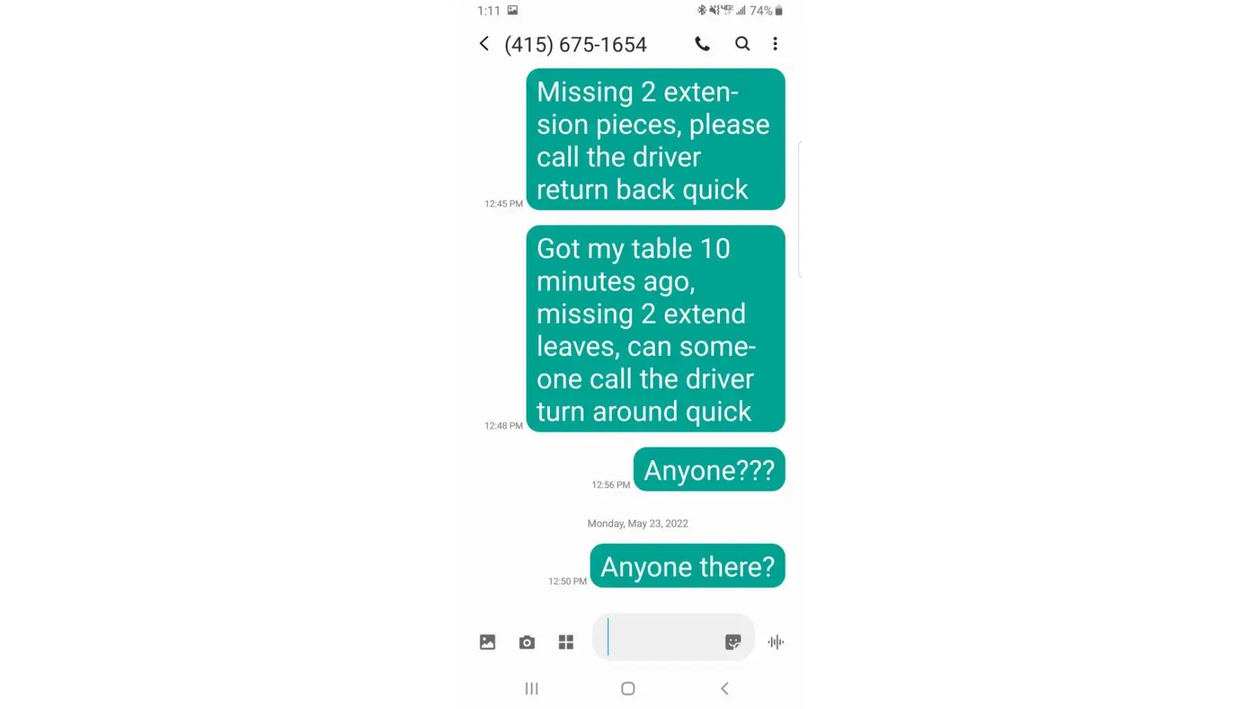 table received not as describe, missing 2 extended leaves, Thought they can help me right away before the drivers drive far away and so within 10 minutes right after receiving my order Sunday 05/22/2022, I called the Pico Rivera store, spoke to person took my information and promised to call me back shortly but never heard anything since, email sent to customer service, and several texts sent to driver and Customer service. and email sent to Jerome's customer service next day 05/23/2022, still no response up until today 5/24/2022.