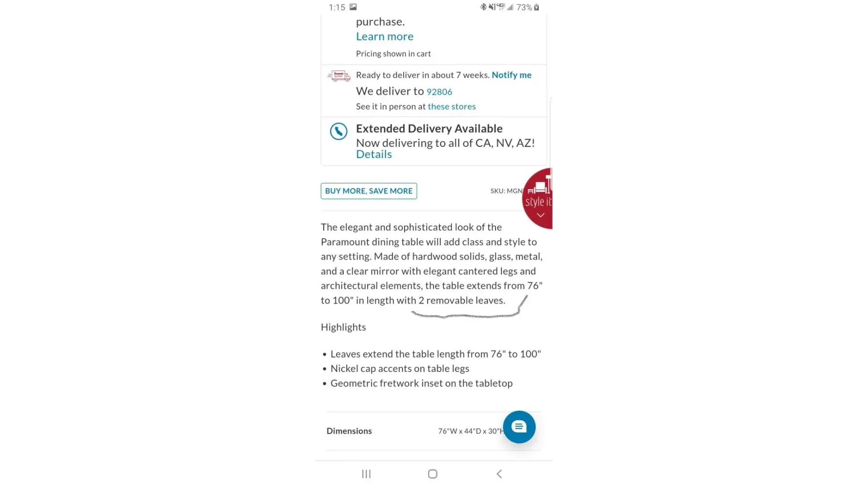 8/21/22, we received a text message stating that the dining table was ready for delivery. I contacted the West Covina store and spoke to someone in customer service and told them that we received a text message regarding the dining table that it was ready for delivery, and if she could find out if there is another table that was in stock. She stated that she would research and call me back.