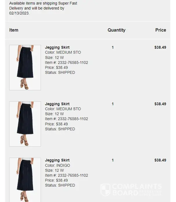 I said I would give it another try. I ordered four skirts size 12W. I wanted them for a special occasion, so I paid for 2-day shipping. I received three skirts and a floral dress size 22.