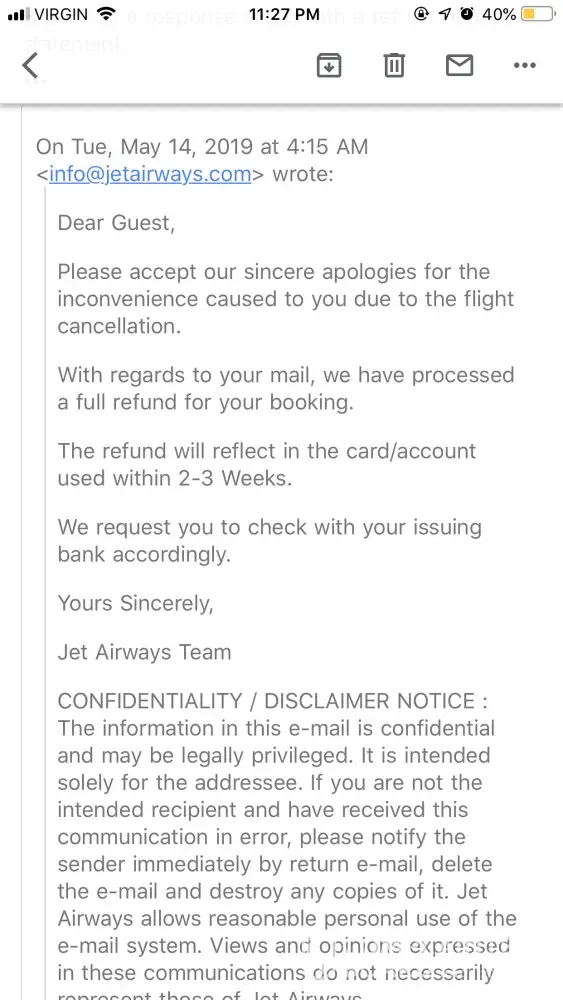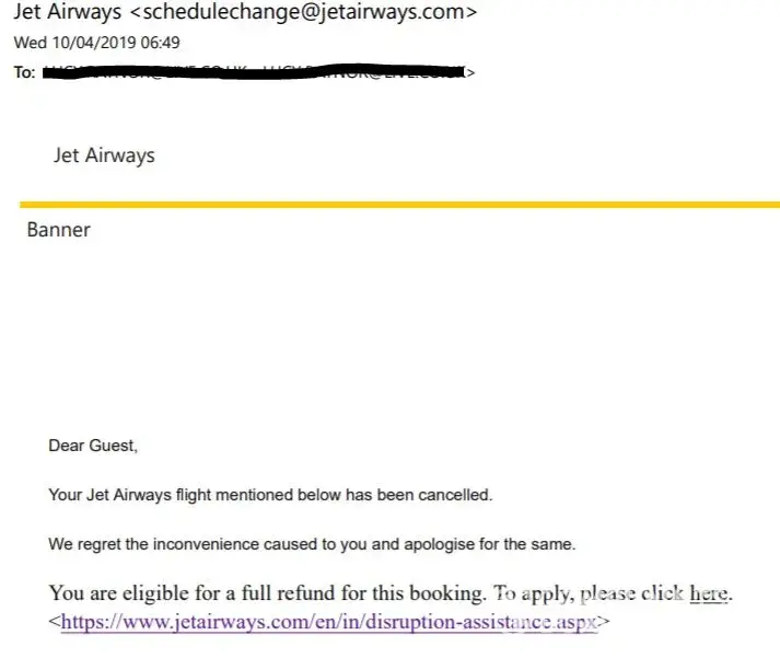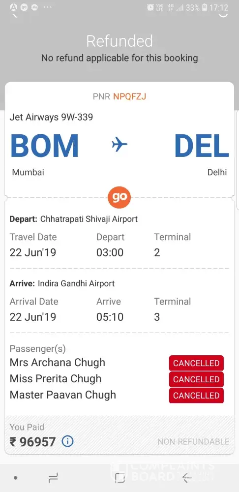 flight cancellation; refund not received from make my trip for jet airways flight shot down