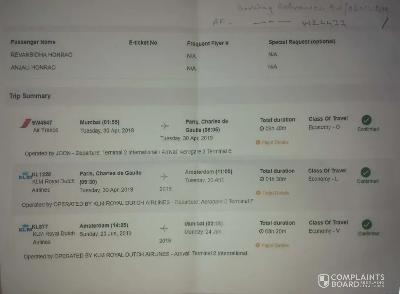 As it said Air France (Operated by Joon), we so checked the reference number on Air France website, and it showed us the booking confirmation from Mumbai Paris, Paris Amsterdam and return Amsterdam Mumbai.