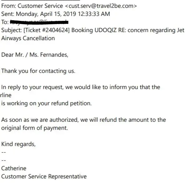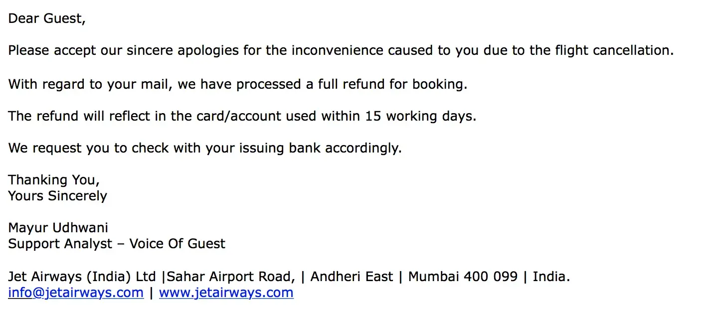 My query is regarding the refund policy and the date for the refund for the cancelled flights of JET Airways. The details are as below: