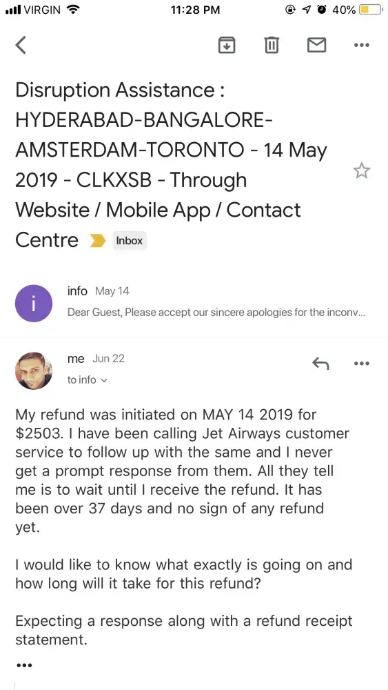 I made a complaint to Jet Airways disruption assistance and they initiated a refund for CAD$2503 on May 14 2019 and I received the email from Jet Airways stating that my refund will be received in 2-3 weeks. It has been about 2 months and no sign of any refund yet. I keep calling their customer service but all they say is that my refund is still in process. It is unacceptable. Need my full refund.
