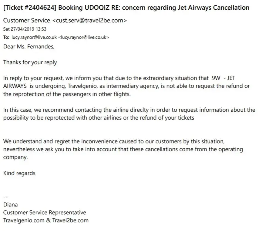 We used your agency to book flights for x7 passengers (total cost 4, 024.00 GBP) back in December 2018. Flights were due to take place May 26th 2019 (Airline Ref: UDOQIZ). As Jet Airways subsequently went into administration, our flights were cancelled. We were advised by Travelgenio that a refund would be processed, and this was the written email we received, however we are still yet to receive our refund. Jet Airways have stated that they have given the authorization for all Travel Agents to refund the tickets, since the money was not used for the flights. We are now seeking legal action and are insisting that our money be refunded. This is not a small amount of money and it is causing us serious hardship financially.