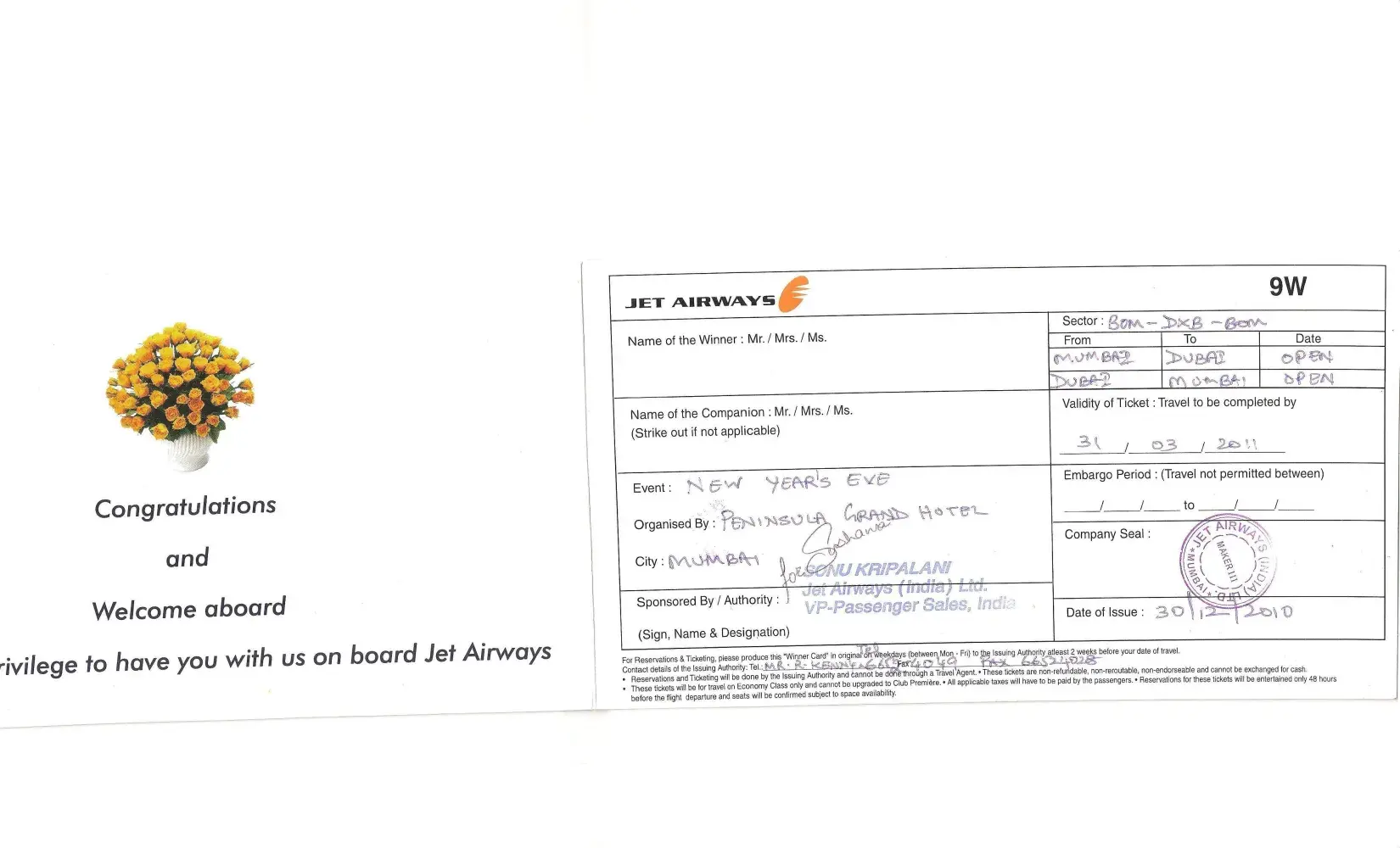 I was awarded a Jet Airways free travel voucher for 2 passengers in the New Year Party organised at Hotel Peninsula Grand at Mumbai (check attachment). The voucher allowed any two passengers free return tickets between Mumbai and Dubai. The validity of voucher was between 1st January, 2011 and 31st March, 2011.