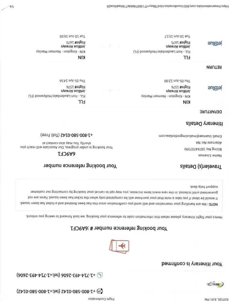 On May 27, 2025 I purchased two tickets from Jet Blue through their aagent Reservation Club. The tickets were from Jamaica to Fort Lauderdale for two persons - my self Lisamae Gordon and my mother Winsome Gordon. The purpose of our travel was to bury my grandmother We were issued two e- tickets. The booking reference which we received eas 6A9CF1. According...