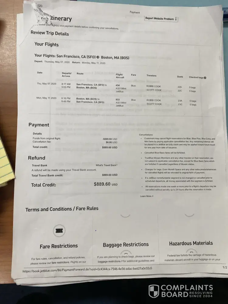 I have a printout from the Jetblue website, dated 3/24/20 indicating that my fight was cancelled; that there would be no cancellation fee (because of Covid) and that funds would be placed in my travel bank account.