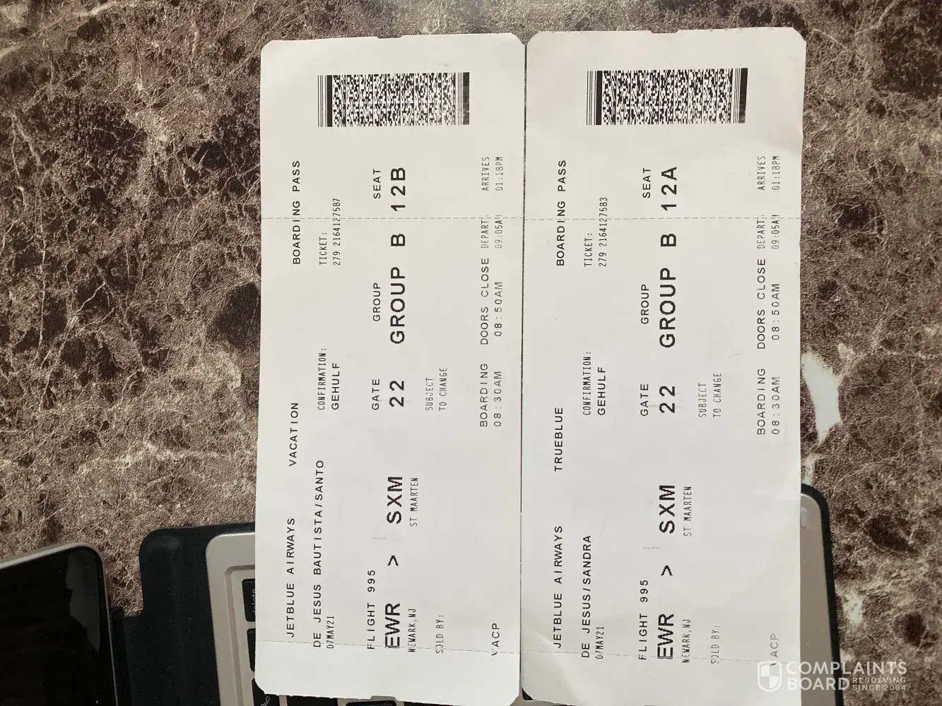 My husband and I had a vacation package from EWR to SXM on 5/6 returning on 5/9/2021. We missed the flight due to St. Maarten not emailing my authorization to travel. We were rescheduled for a flight the next day out of gate 22. I received an email that the flight will be delayed and departure will be at 9:25 am. By 9 am, there was no calls for our flight. I heard commotion at the counter where people were upset over gate changes without being notification. I approached the counter and was told my flight was at another gate. Several minutes later I was told I was told we had to go to a different hanger for out flight. We ran, went through metal detectors but arrived as the plain was pulling out. They offered to reschedule us for Saturday but our return day was Sunday and had to work on Monday. I called customer service and they said they could give me a credit which I declined and demanded my money back. They processed a reimbursement for the airline portion but not the hotel and told me that because I didn't go, I could not be reimbursed. I was informed that JetBlue will be emailing the hotel and it would be up to them if they would reimburse. I demand the entire hotel cost which is $840.43 be reimbursed back to my credit card as it was the airline failure that we missed the plane.