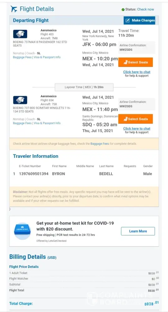 Then both airlines charged my card for the fare in addition to Expedia charge. I did contact the Expedia who state I need to contact the Airlines. I would like to open a complaint case with your company and expect a response from a supervisor.