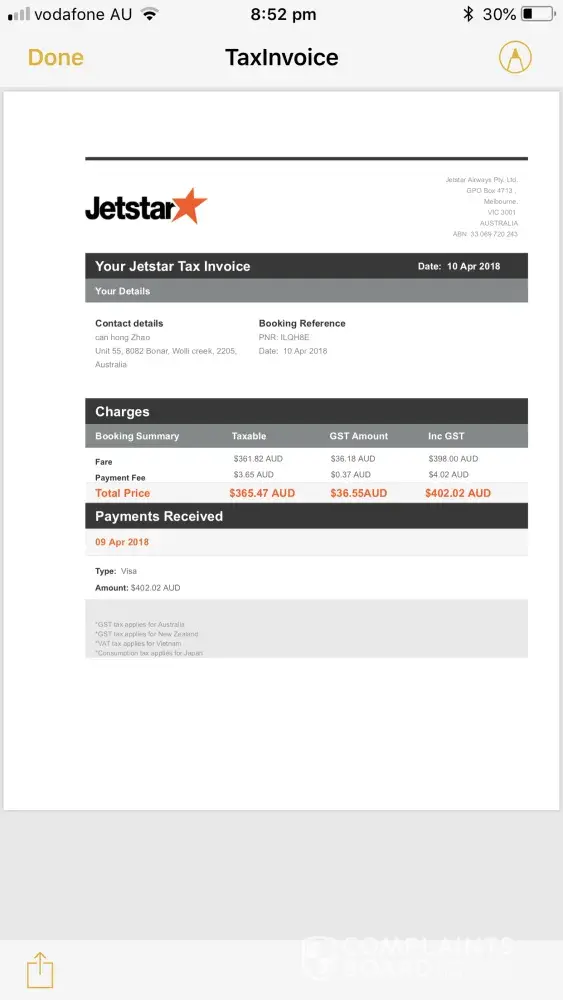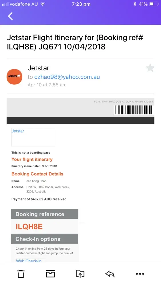 I booked Jetstar flight from Darwin to Sydney on 9 April 2018 afternoon. The time of the flight I booked and paid was flighted from Darwin at 1:20 am on 10 April 2018 and arrived in Sydney at 6:05 am on 10 April 2018. However I received email of my itinerary at 7:58 am on 10 April 2018 which is well after the expected arrival time in Sydney ( 6:05 am) see attached email itinerary from Jetstar. As a result, I missed my flight and I was forced to buy another flight to Sydney. I've contacted Jetstar customer service and adviced to lodge formal complaint. This incident was not only causing me delayed my work in Sydney but also loss of $ 402.02 fare see attached tax invoice. I believe this incident is caused by Jetstar not sending my flight itinerary on time and therefore Jetstar should take full responsibility for my loss of working time in Sydney and fare of $402.02. I demand Jetstar to refund my fare of $402.02 and compensation for my loss of one working day (8 hours) $ 360 (my working hour rate is $45). As I've made numerous calls to you customers services team regarding this incident since I backed on Sydney on 11 April 2018. I would expect to receive your response with 7 working days or I will lodge my complaint with Fair Trading and Airline Customer Advocate. Kind regards