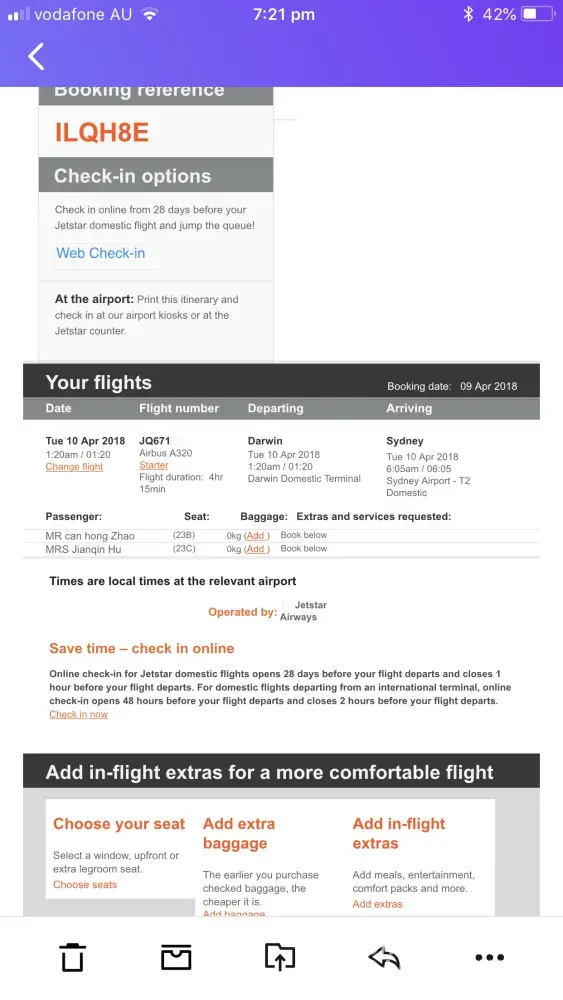 Please find following my email content to Jetstar, it has all the details. I would like to have the fare reimbursed for the stress it caused. I have sent 2 emails plus submitted the complaint via their chat line.