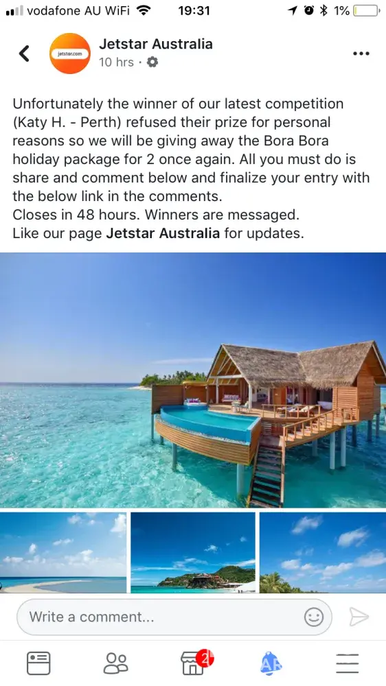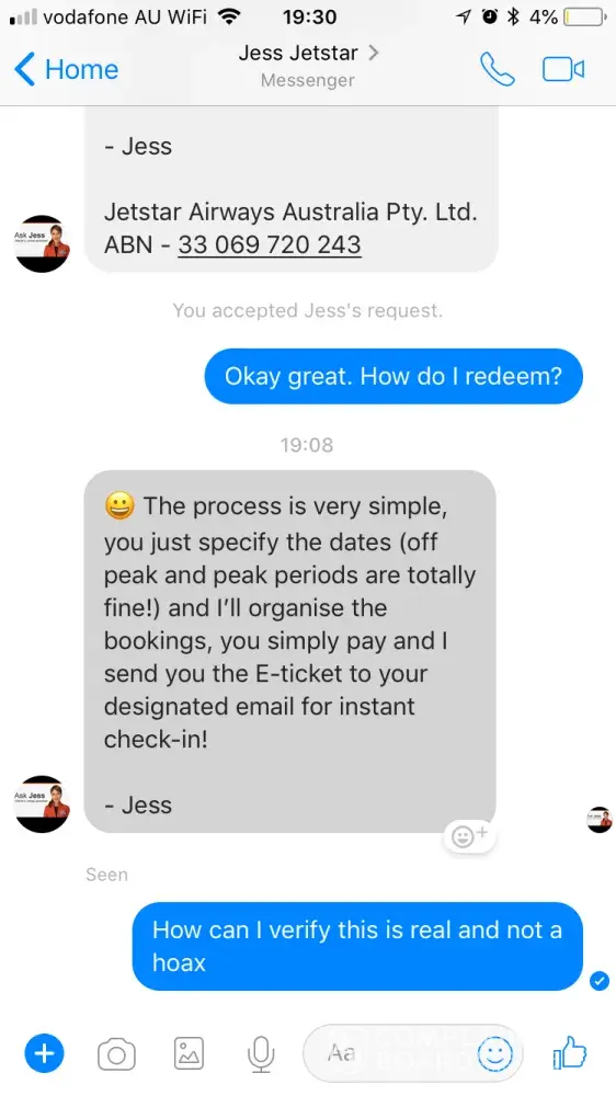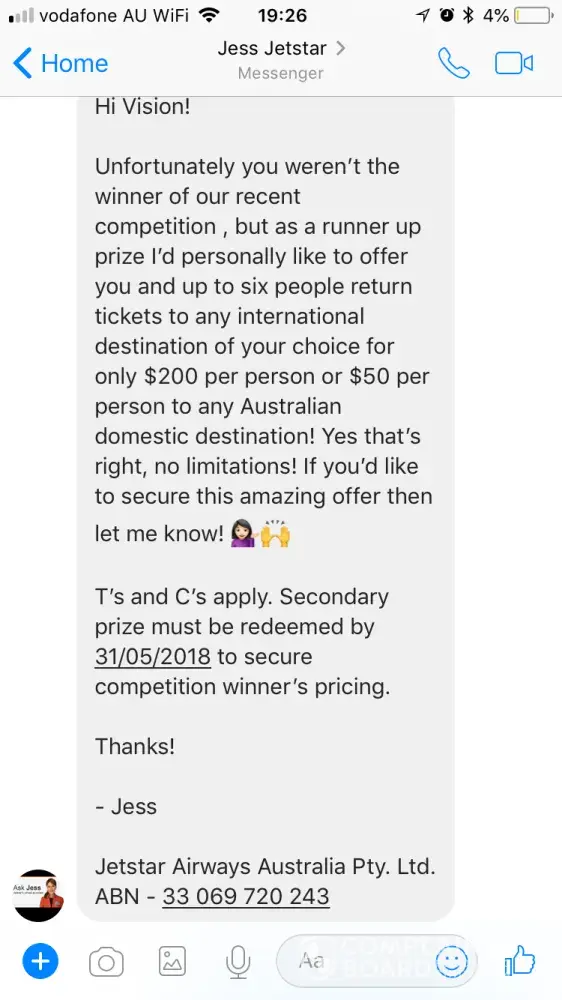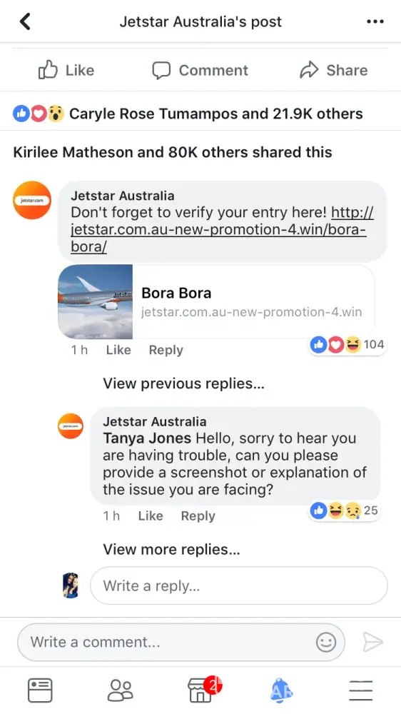 Hi I just want to report the fake Jetstar Australia Hoax page, I know it has been reported already but it hasn't been taken down and thousands of people are liking and sharing it. They are also using a fake profile, "Jess Jetstar" to message people and say they're secondary winners, which would eventually lead to people transferring them money for a cheaper flight.