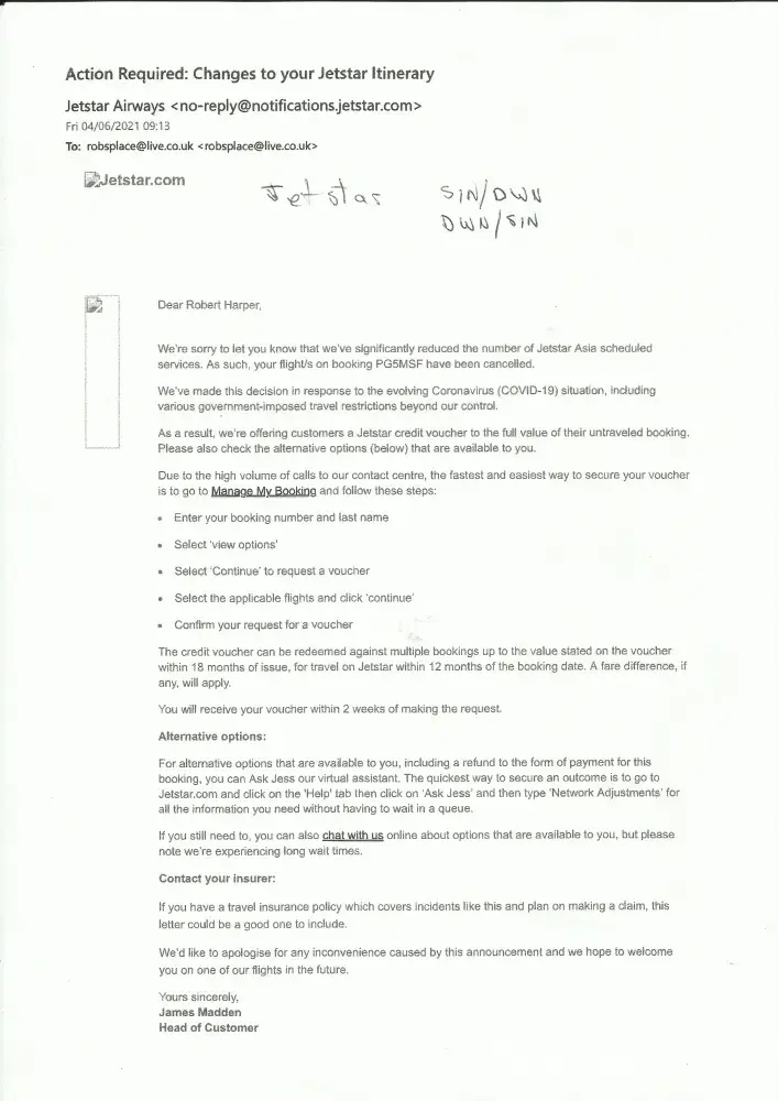 I have received an email from Jetstar saying my flights have been cancelled. It says to go to 'Manage my Booking'. However all I get is a blank page or message saying 'Unavailable'. I have tried live chat and phone, several times, but cannot get through. in fact none of the contact information works. My booking reference is PG5MSF for return flights Singapore/Darwin on 03 September2021 and return on 28 October 2021. Email; [protected]@live.co.uk