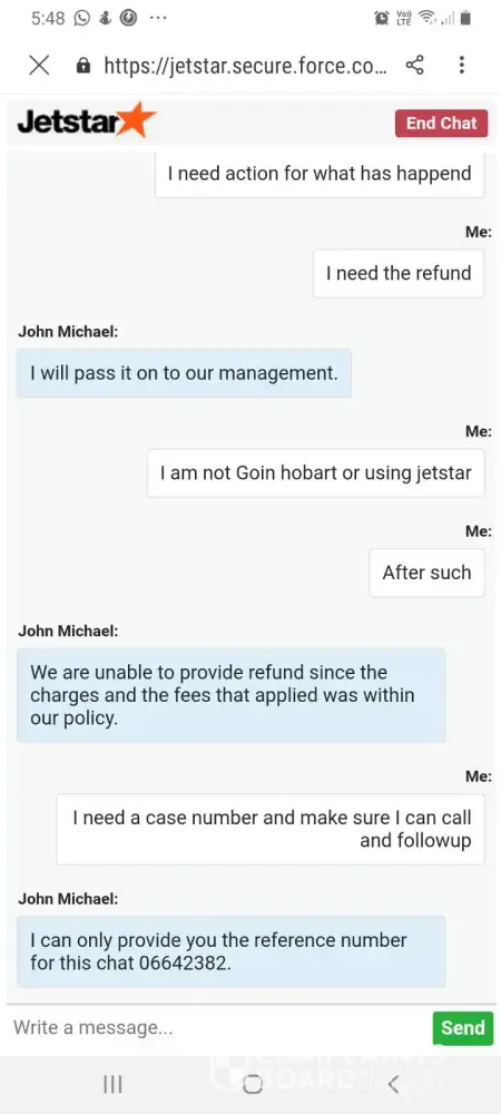 I also am not satisfied in the complaint procedure with Jestar - I couldn't converse with a supervisor (I chatted online and also called - in both circumstances, they couldn't put me on to a supervisor. In the telephone call they transferred me to no-one and then the phone just dropped out), they couldn't provide me with an email to send a written complaint etc. To me, this simply isn't good enough as a consumer. I specifically asked for a customer care case to be raised to raise a complaint about how I was being treated and they stated they could not do this over the phone and it would have to be done online via the 'Contact us > Complaints' page - however, there was no option on that page for me to contact anyone.