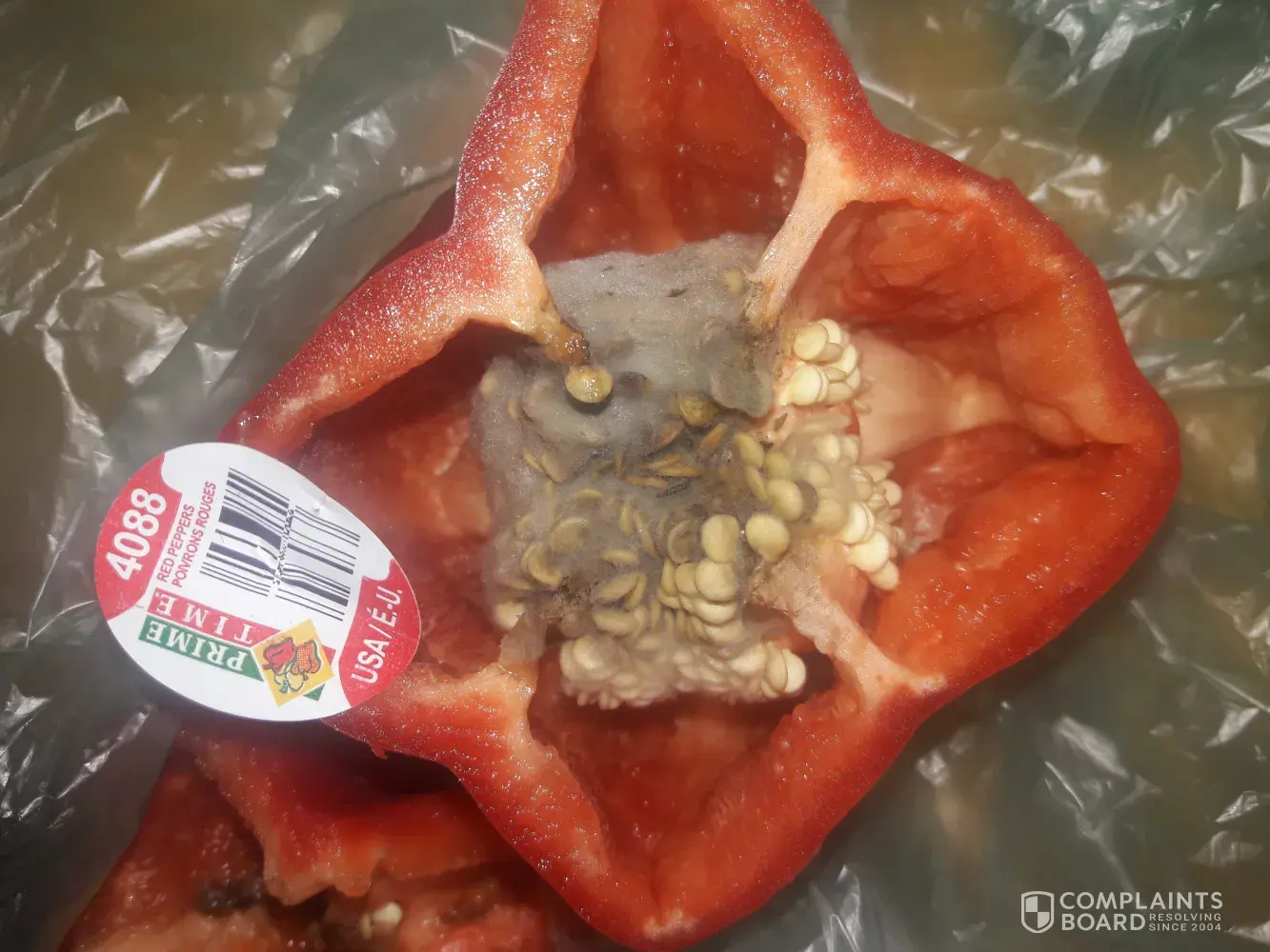 I purchased a red pepper (that looked great on the outside), and there was something horrible that had grown inside of it. It looked like mold and/or something that had died inside of the red pepper. I'm concerned about the quality of vegetables being offered. I have been a customer of Jewel-Osco for over 40 years, and find this very disconcerting. I took a picture of this red pepper.