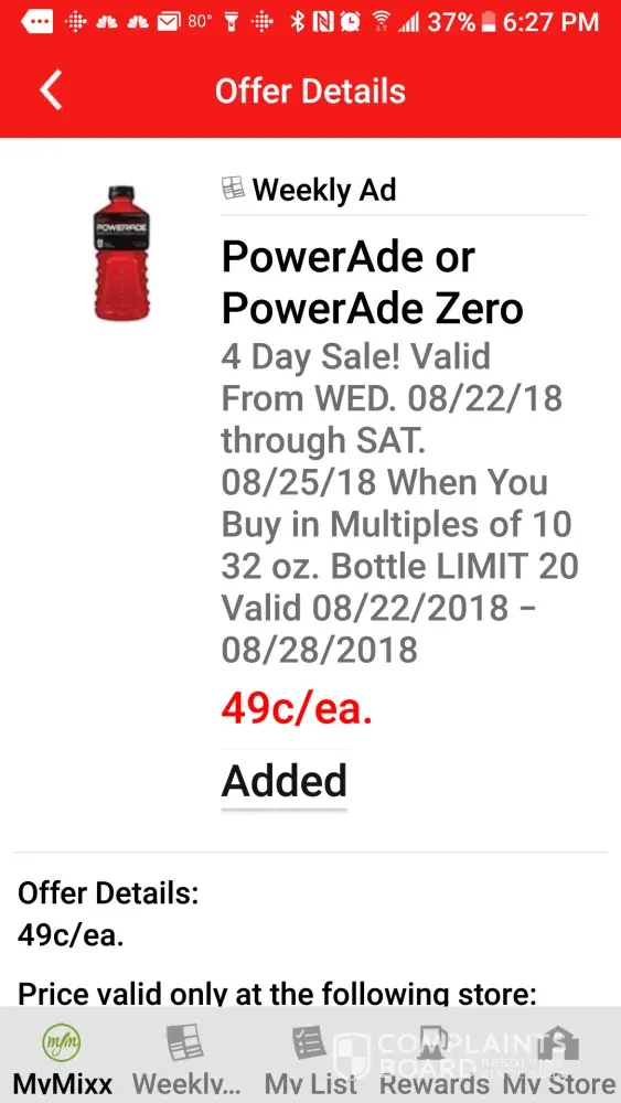 On 8/19/18 I purchased #15 powerade drinks for 88ct each. On 8/24/18 I noticed they were on sale for 49ct, so I purchased #30 bottles. I spoke to customer service and asked if I could get the a price ajustment. I was told I would have to bring all #45 bottles back into the store in order to get the price ajustment.(Really). I then went and purchased #15 more because they were suppose to still be on sale for 49ct. I was told they are 69ct now. They were advertise for 49ct until 8/28/18 and I had to pay 69ct. thank you! Gilda