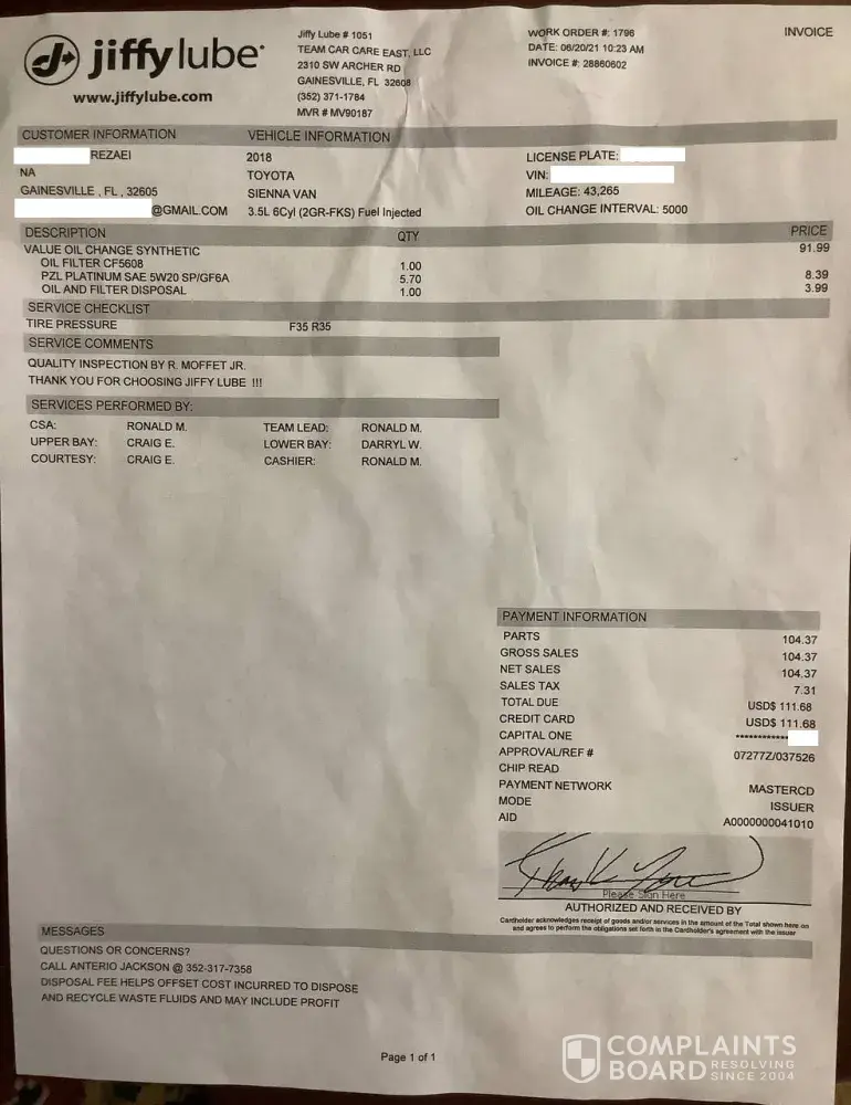 I have no trust and respect for the Jiffy Lube company, and believe me, I will tell all my friends in my area what happened to me. “This is not fair to your customers to have their money stolen from them. “Appalling.’