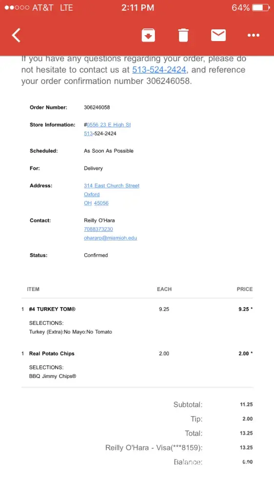 So, Saturday 09/16/2017 he NEVER contacted me. I sent him a text message at 1:44pm (He gave me his cell phone number). The text message I sent him was of the charge that was still pending on my sons account. He responded with my son’s receipt that had the address for Canyon High School (1510 I-35, New Braunfels, TX 78130) and that he would refund the order “this time†(see picture below). Why this time? My son was apparently told that they don’t deliver to New Braunfels High School (Mark heard him being told that), my son never received his sandwich, and he was still charged for his order. I replied and told him that I was very appalled with how this was being handled and how I was treated and Mark NEVER apologized. VERY poor costumer service.