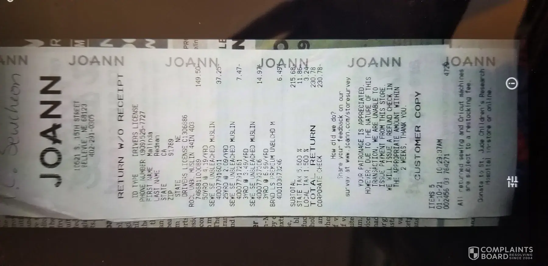 I was issued two refunds for corporate refund checks on January 10, 2021 to be sent to me. I had been in communication with the Store manager and Asst. Store manager who actually assisted me with three previous returns (signing them) on my recently deceased mothers un-used new material as l etc. Each received a corporate check for dates of January 3, 2021 & December 20, 2020 & and a cash refund of $ 120.00 on December 18, 2020. All without receipts but luckily still in the original packaging, mfg boxes, and Joann bags. My January 10th refunds never arrived so I reached out to returns customer service for status. I was than told to pick up the fabric or take a store credit? A day later I received a email from customer service asking for detailed information on my return, email, original dates of purchase, which I quickly replied with and asked why they are asking for all this additional information...No one could tell me why? The store manager said the store policy was changed, inwhich I was bring penalized for their policy change after my transactions were done? Basically I was being called a thief and they were trying to imply that 3 bolts of unbleached muslin were stolen? Funny how when I returned it the sales associate was able to scan the bolts and the bolts were identified in the Joanne SKU files in their computer system?Absurd! I was given the choice to pick up the bolts of muslin or a useless store credit. I than took the store credit as they threatened that if I did not come in soon I would be forced to forfeit my merchandise/store credit! What a way to treat someone who's late mother taught all the quilting, cake decorating, needlework adult education classes in Bellevue, Ne. My late mother bought all her needs at this Joann store in Bellevue, ne. She also encouraged all her students to buy all their needs for class and leisure at this store. Pathetic way of biting the hand that keeps your sad little store open in Bellevue, Ne! Talk about Bait & Switch on an honest customer! No wonder this store is so empty. I have/will notify all local contacts of this horrible experience with trying to defame my character without any grounds, basis, or reasonable explanation. Even the supervisor at the returns customer service did not have the courage to call me and explain why the 30 day runaround? Cowards and shady business practice!