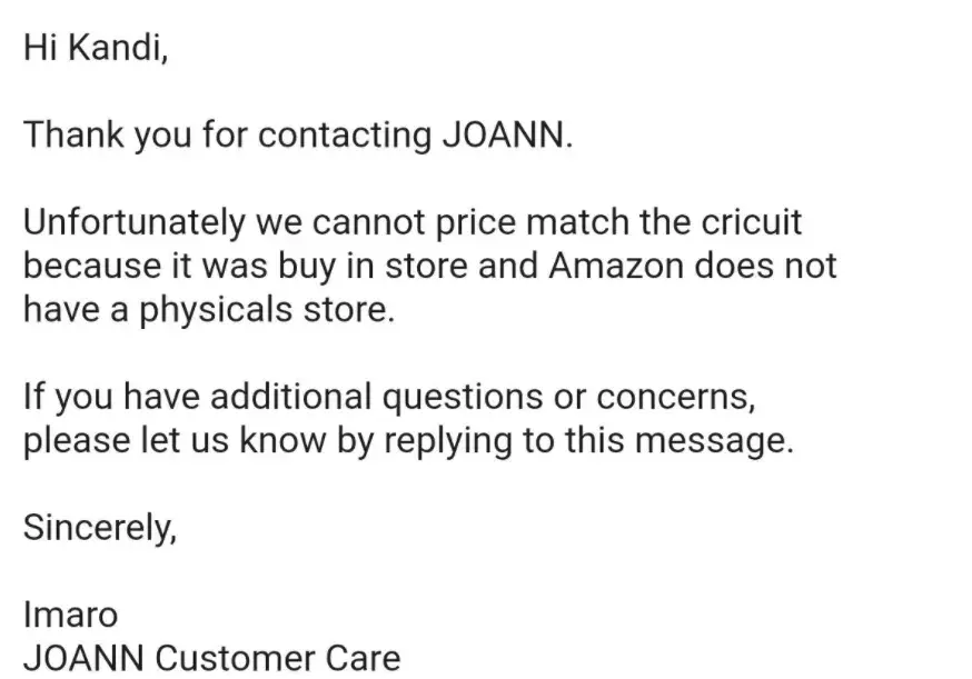 I purchased a Cricut on 5/10/21. I found this same product online at Amazon for $329 in stock. I sent all of this information to customer service and they said they do not price match Amazon. But, on your website it clearly states that you price match certain online vendors and Amazon is listed as your first. I would like and explanation as to why I am not able to get a price match. I was told in 2 separate emails that it is because you cannot walk into a Amazon store to shop but if that is the case it should not be on the website that you price match online vendors and then list them.