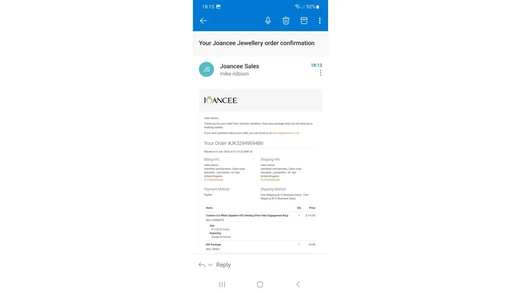 Ordered an eternity ring for my wife for Valentine’s Day. Delivery was said to take 10-15 working days.
