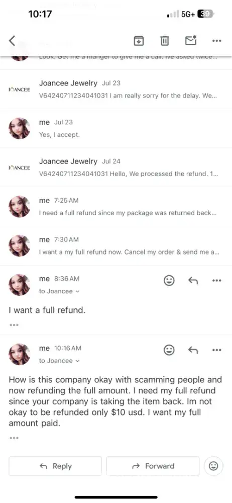 I was really hoping for some real communication, especially since I paid for expedited shipping. I mean, if I'm going to spend that kind of money, I want to know that I'm getting what I paid for. Unfortunately, that just wasn't the case with Joancee. It's really disappointing to see a site that promises so much fall so short when it comes to actually following through on their sales.