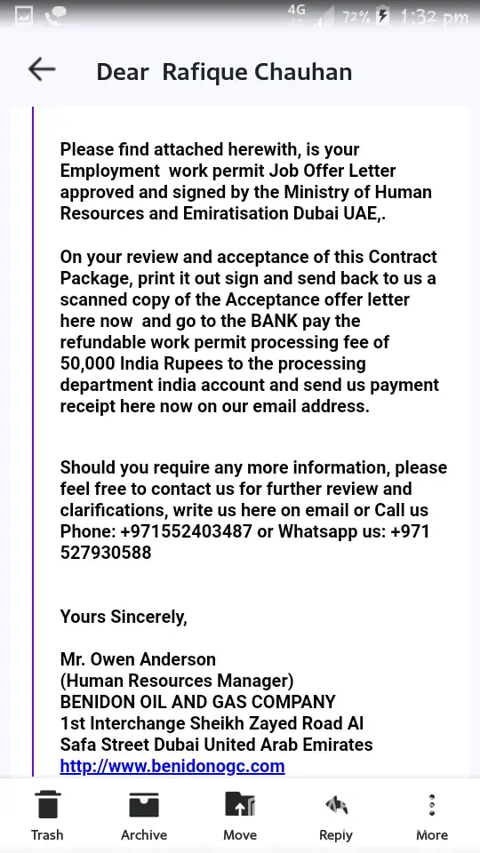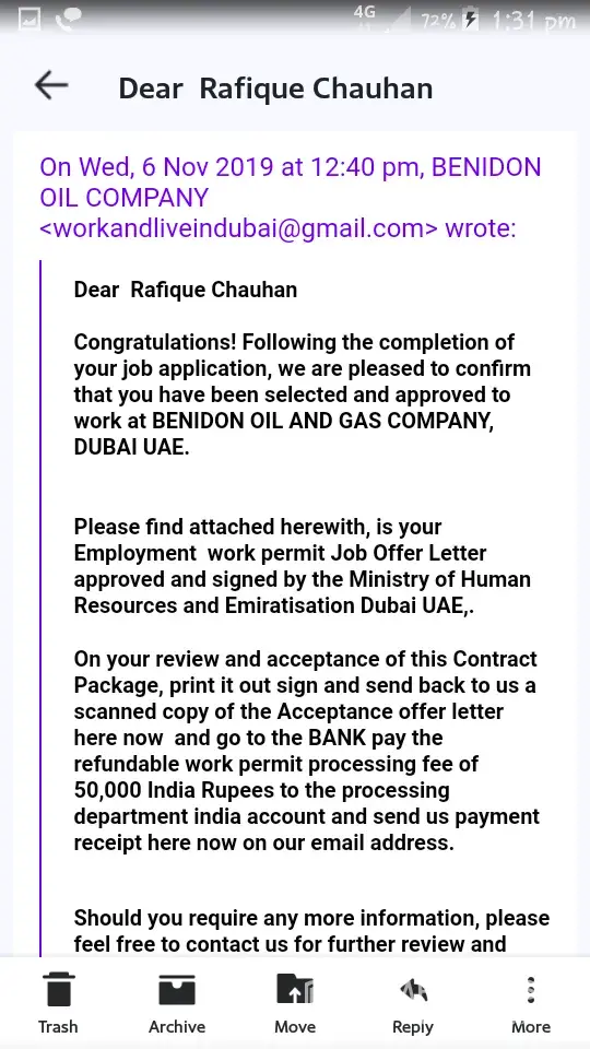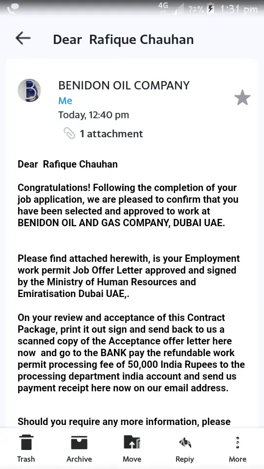 Hello I apply for a job on facebook benidone oil colony.the provide me mail I'd to send my documents. After that they me a form to fill and send back to same mail I'd .in the last the send me a offer letter also in letter they are demanding 50000 Indian rupees for processing fees.I requested please give me favour or deduct that amount in my first salary.