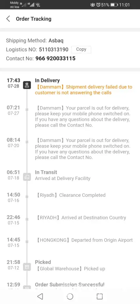 5110013858 Still not get my order it's keep showing me the out for delivery and no one contacted me.. and upto last they will cancel by saying changed address or customer didn't respond.. whenever my orders delivers by asbaq I faced many things .. nowadays zajil are best..