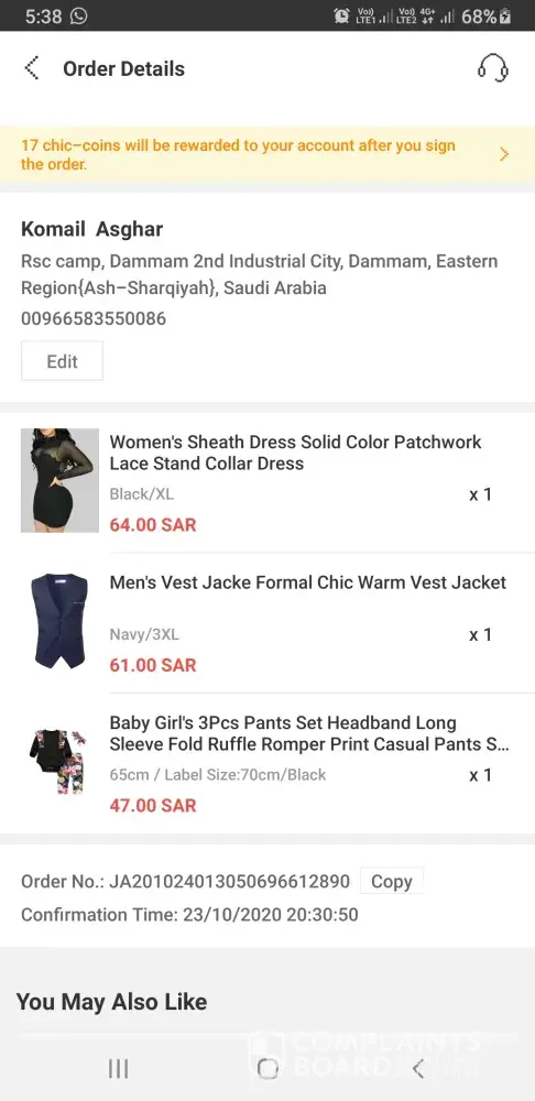 I have an order with jollychic for bike accessories with an order number JB200423192650419043131 but until I have not receive this order. Its almost one month already since I order this product and payment already been made. the logistic no from Asbaq is 5103298440. I try to contact Asbaq but could not get in touch with them.
