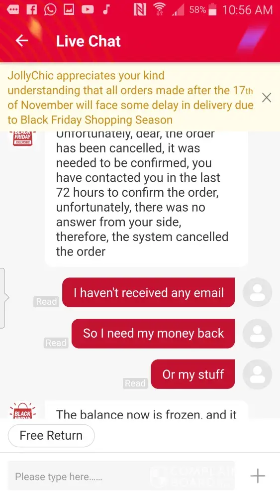 And then I wasn't home. I had clearly told the agent it's fine I'll come and collect it from Fetchr pick up. She told me she will send the address via email but unfortunately she didn't. And the next day I received an sms saying your order has been dispatched for delivery and expect delivery today. I didn't receive anything. The next day when I called up Fetchr, they told me they have returned it to JollyChic.