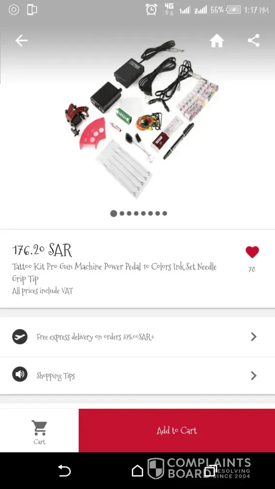 I paid tattoo kit (Royal-Buy Tattoo Equipment Kit 20Colors Machine Power Needles Ink Set#5XPB80B2602G) for 209.99 SR + shipping fee + cod fee but they send wrong tattoo kit (Tattoo Kit Pro Gun Machine Power Pedal 10 Colors Ink Set Needle Grip Tip#5XPB80B2602F) worth 176.20SR.