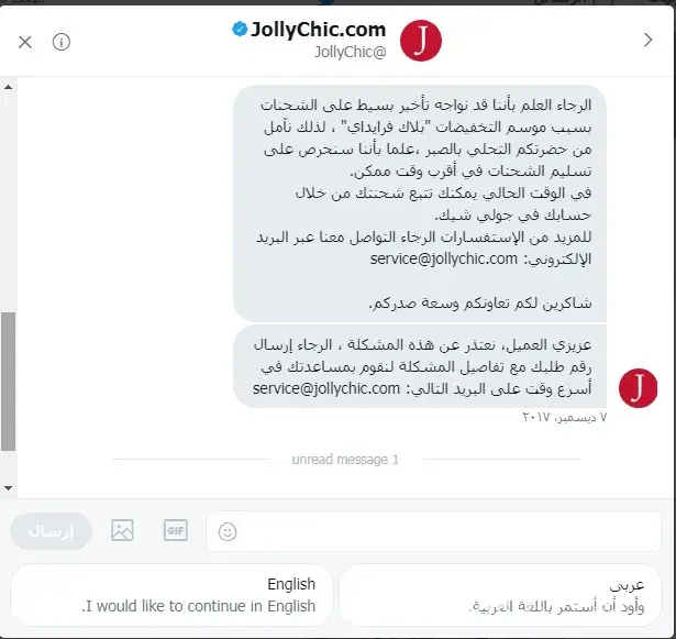 7- on the same day 2nd December 2017 .. we called Jolly chic Kuwait contact number inquiring about this cancellation (Attachment 8) and their reply was that : "the order was cancelled because we failed to answer Jolly chic order confirmation calls on 3 different occasions (which never happened and didn't received any call or email or notification else than the missed call on the same day morning while we were sleep). And we may place another order (while most prices became at least double and some other items out of stock) They advised they they are trying to solve this issue and get back our order with the same prices and they suppose to get back to us within 72 hours which till 4 days now no one approached us .