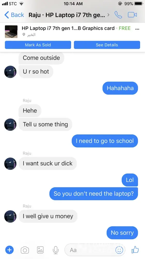 A delivery boy of jollychic wanted to buy my laptop which I posted online. He contacted me and made a deal and wanted to check the laptop as soon as possible. So I sent my location. He came and everything went fine until he told me that he wanted to suck my [censor]. He waited outside for like 20 mins untill I got mad and confronted him and saw that he works in Jollychic so I took a photo of him and here I am reporting and hoping that you'll find a way to deal with this thank you so much.