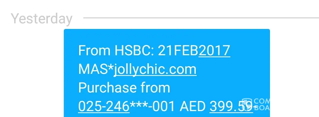 "From HSBC: 21FEB2017 MAS*jollychic.com Purchase from *-001 AED 399.59-".
