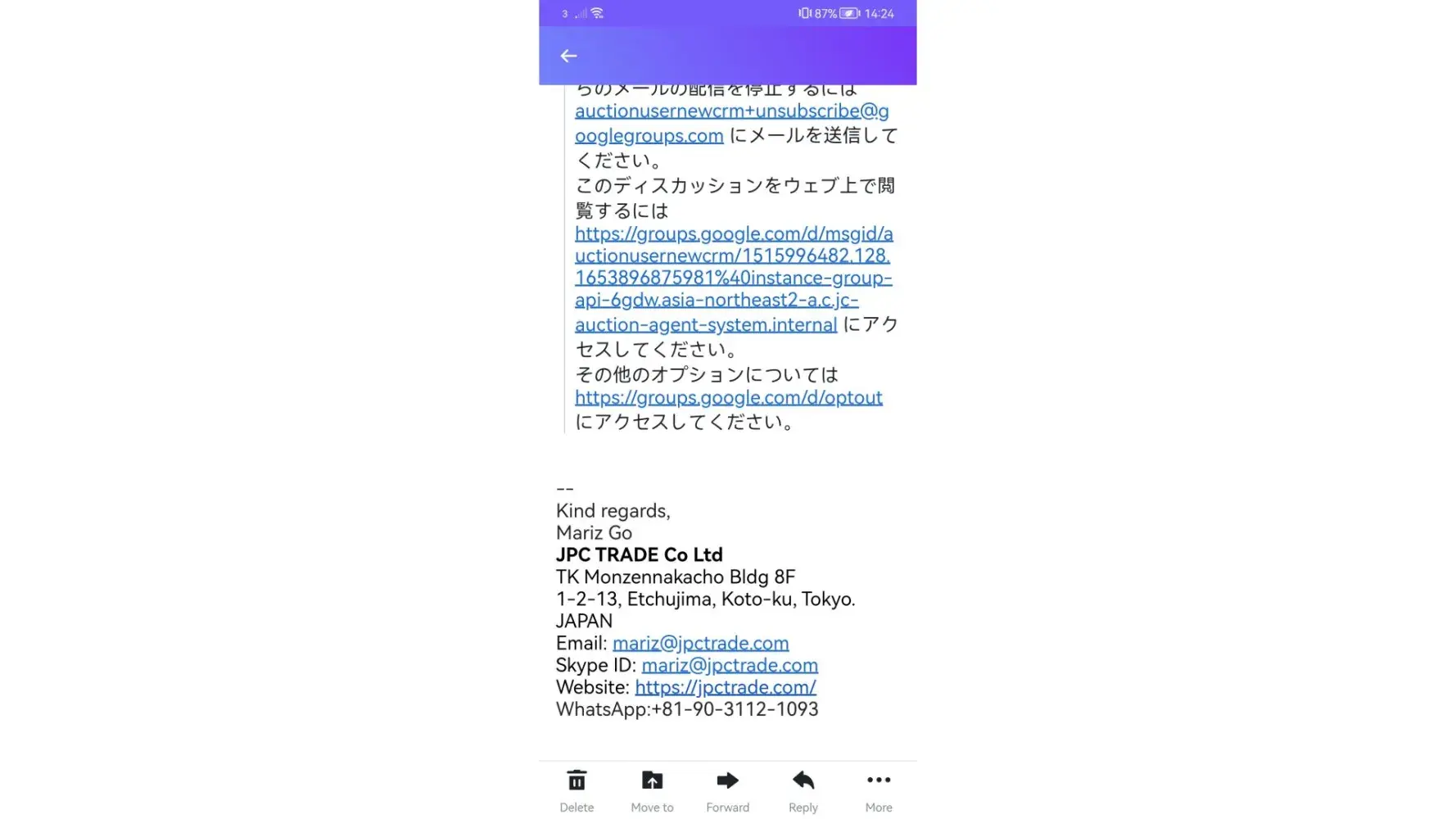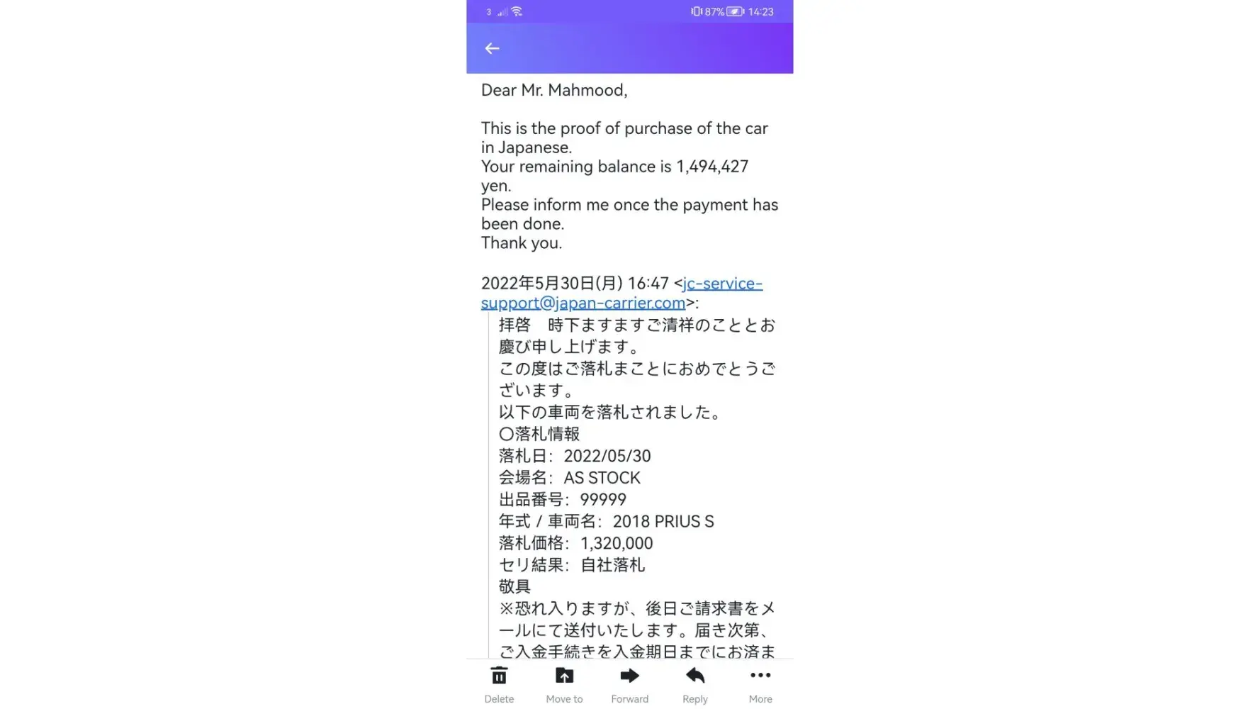 I am going through same. Purchased a car 4 months ago no reply no shipping date. The staff have no idea constantly watts app message only not a honest company. Going through Japanese embassy to talk to trade standards . What a waist of time and money.