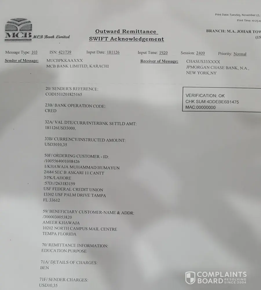 My father sent an amount of $3, 000 from Muslim Commercial Bank in Pakistan on 11/26 to my account in USF Federal Credit Union Bank. The MCB bank in Pakistan charged $10 fee on top of this amount while USF Federal Credit Union Bank here in Tampa charged $10 wire transfer fee. The funds were routed through JP Morgan Chase Bank, New York, NY, please see attached the SWIFT acknowledgement. However the amount transferred from the JP Morgan Chase Bank to to my account in USF Federal Credit Union Bank are $2, 962. Please let me know why $38 were short in this transaction.