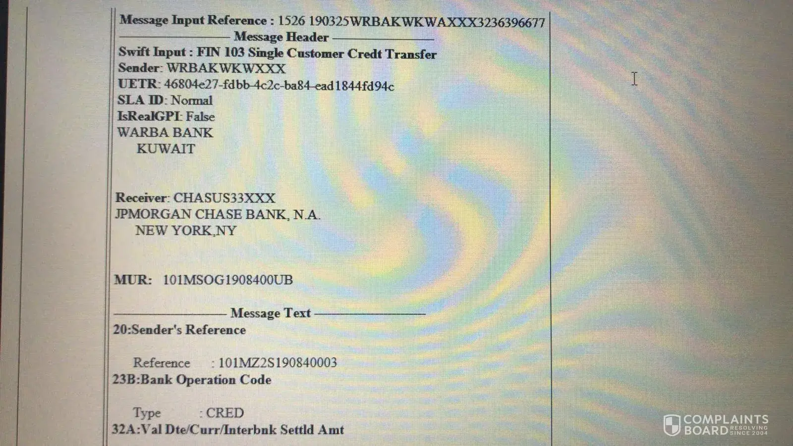 i need few guideline about the remittance. i am exporter by perfoshien and my customer send down payment from Kuwait below is attached TT slip and swift MSG. My bank is saying that they are not able to trace the wire and my customer is saying that wire is gone through GPMORGAN CHASE BANK . Would you able to inform the status of the wire ?